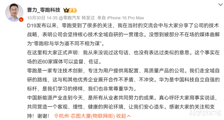 近日零跑高级副总裁发文表示,网上所说的“零跑称与华为道不同不相为谋”是被曲解的,自己从来没有说过这句话,也没有表达过类似的意思;在零跑D19发布之后的技术交流会上,有近60家媒体可以监督、佐证自己没有说过这句话。